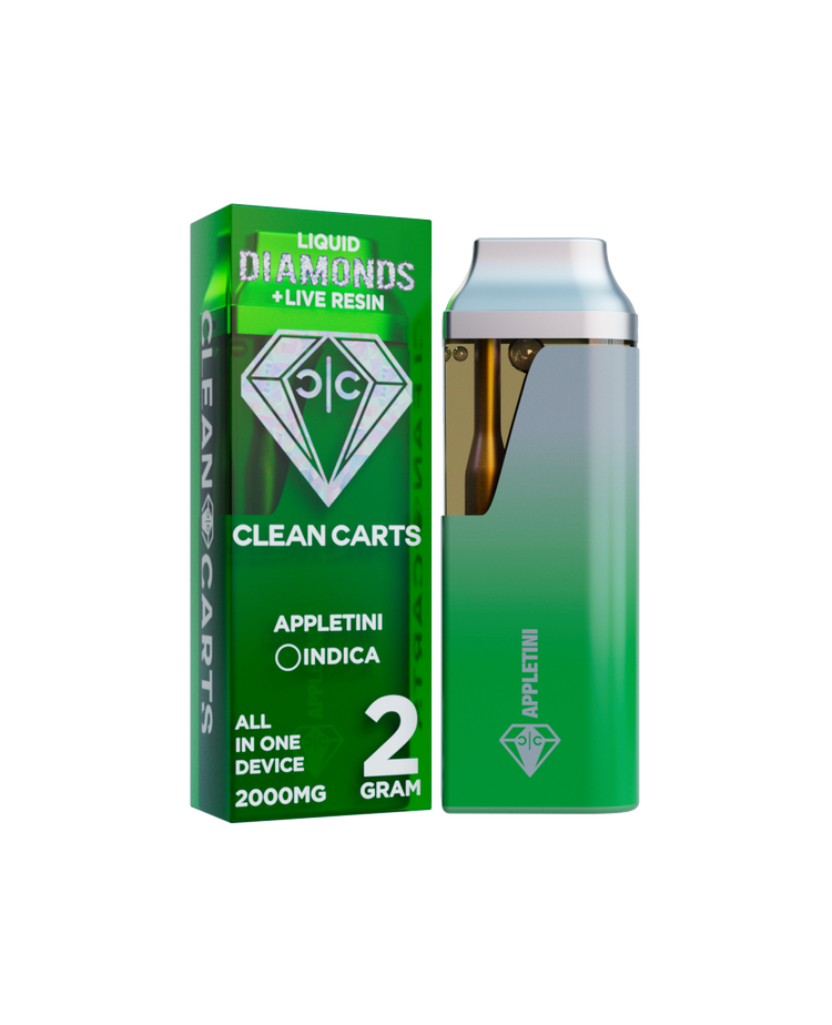 Savor the deliciously refreshing Appletini 2G Clean Carts Liquid Diamonds + Live Resin All-in-One Device. Each puff delivers crisp green apple sweetness with bright citrus undertones, creating a flavorful and smooth vaping experience reminiscent of a classic cocktail.