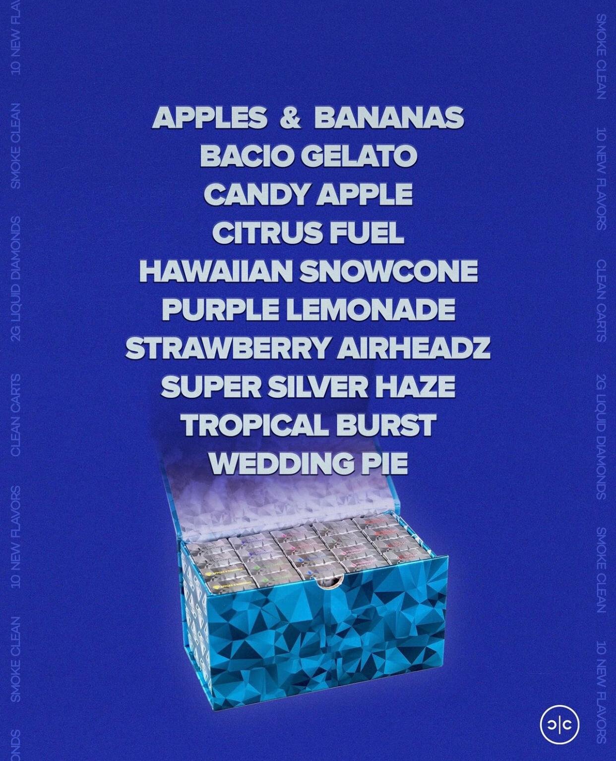 1 box contains all 20 of the 10 new Clean carts 2g liquid diamonds + live resin blue box flavors
