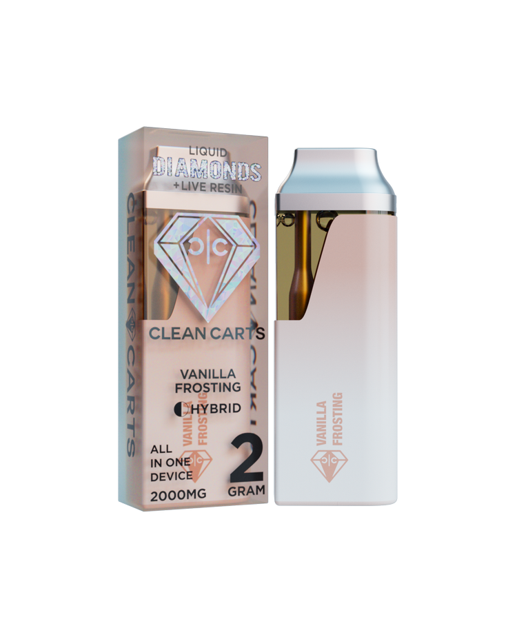 Indulge in the sweet, creamy delight of Vanilla Frosting 2G Clean Carts Liquid Diamonds + Live Resin All-in-One Device. Each puff brings the rich flavor of classic vanilla frosting with subtle sweet undertones, delivering a smooth and enjoyable vape that satisfies flavor lovers.